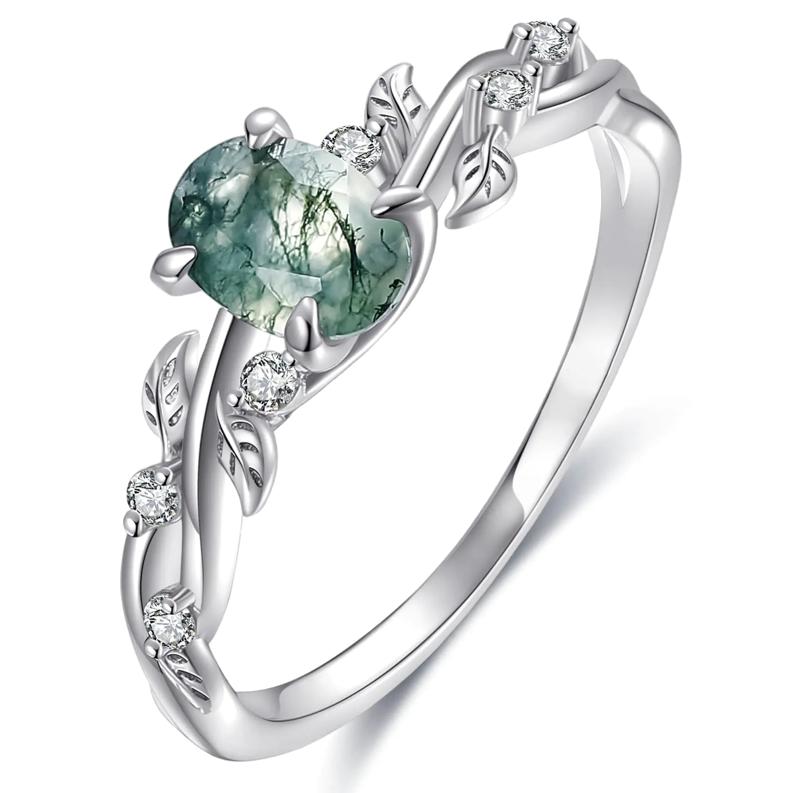 Embrace nature's beauty with this stunning genuine moss agate engagement ring. Featuring a 1.5CT oval cut moss agate stone (6x8mm) set in a unique leaf-shaped design, this ring is perfect for the bride who appreciates organic elegance and one-of-a-kind jewelry.